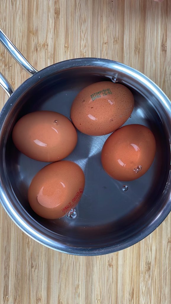 Place 4 of the eggs provided (the fifth will be used for breading) in a small pot and cover them with water.