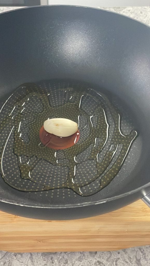Break up the sausage by removing the casing.Heat the extra virgin olive oil in a pan, add the garlic clove and let it brown.