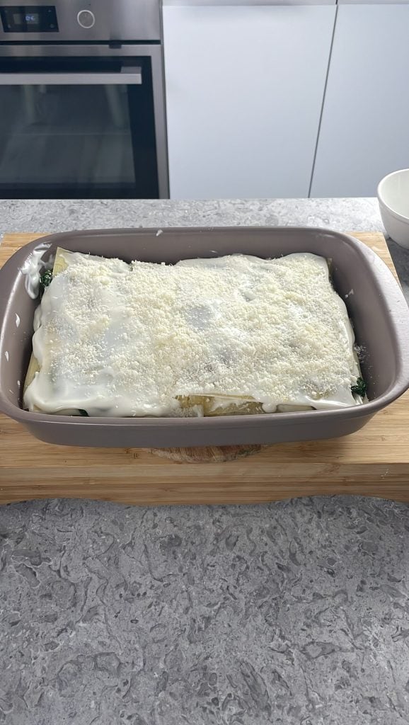 Repeat the operation for another two or three layers.Finally, cover the lasagna with 4-5 tablespoons of béchamel and a generous layer of grated Parmesan cheese.