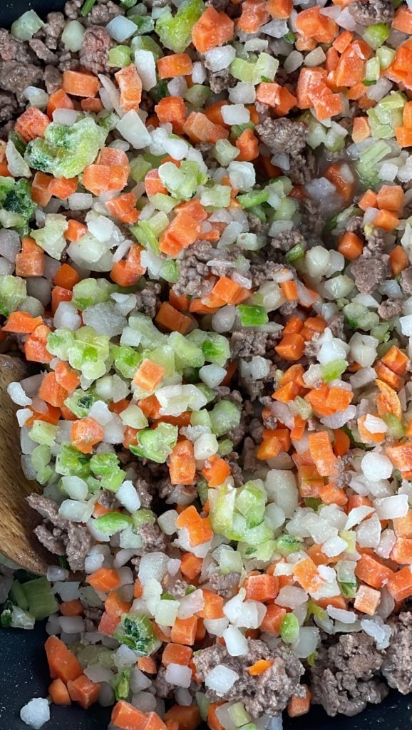When the wine has completely evaporated, add the sautéed mix to the pan (I make it at home by chopping celery, carrot, and onion and freezing it) and cook for about 5 minutes.