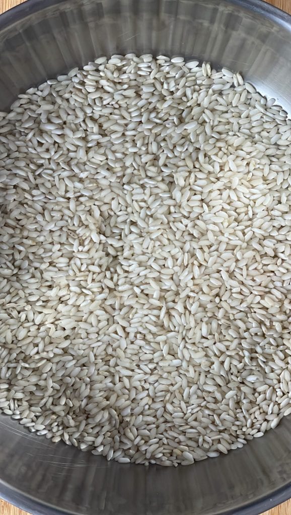 Add the rice and toast it without oil for a couple of minutes or until you can no longer hold the grains between your fingers.Deglaze the toasted rice with half a glass of white wine and the juice of one lemon.