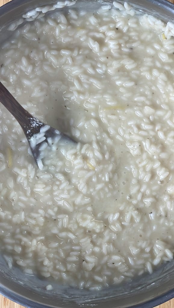 Turn off the stove and cream the risotto. Put the butter, grated Pecorino Romano, lemon zest, and black pepper into the pot.
