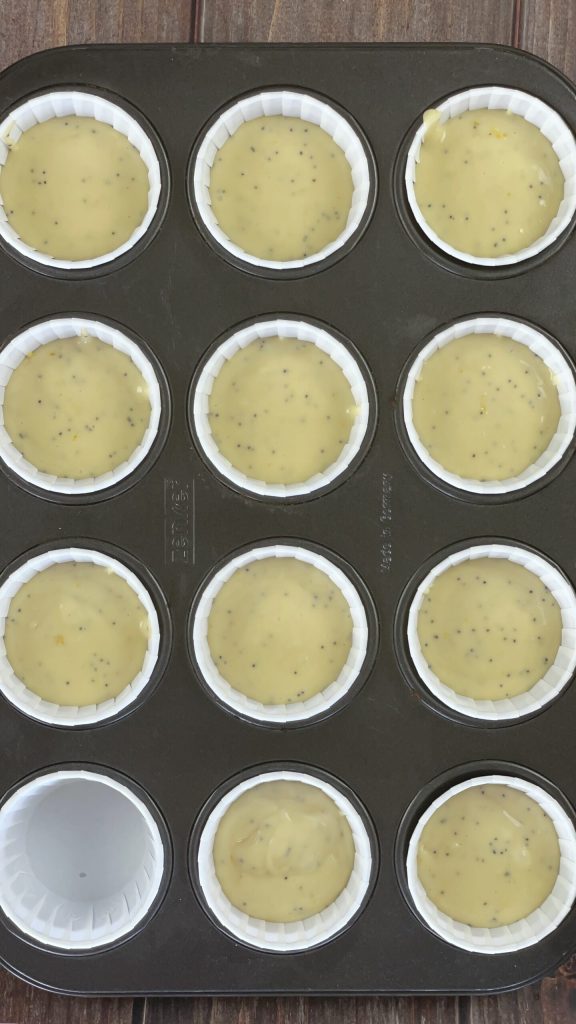 You can use a spoon or an ice cream scoop.Bake the lemon and poppy seed muffins in a preheated static oven at 350°F for 20-25 minutes.