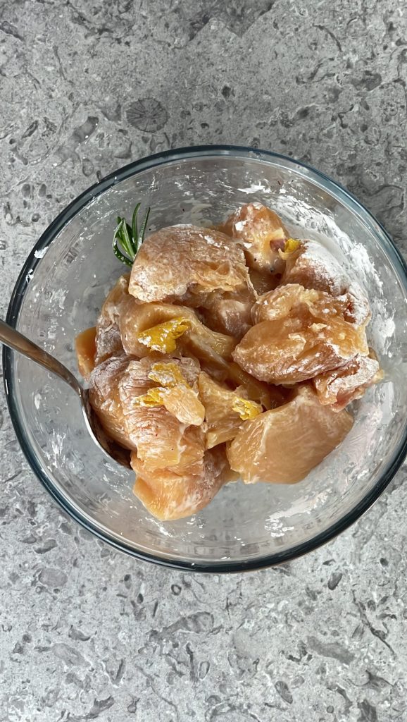 Add a sprig of rosemary and a crushed garlic clove.Add a tablespoon of cornstarch to the bowl and mix well with a spoon.