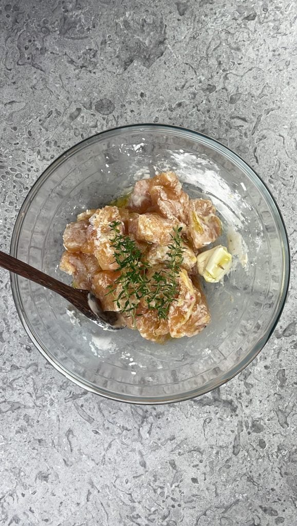 • Continue the preparation with two cloves of garlic, 2-3 sprigs of thyme, the juice of half a lemon and one tablespoon of extra virgin olive oil.