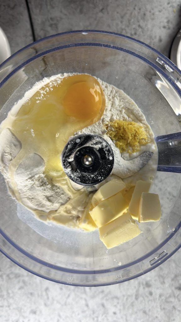 • Begin preparing the lemon scones by placing the flour, granulated sugar and baking powder in the jar of a blender or in a food processor.