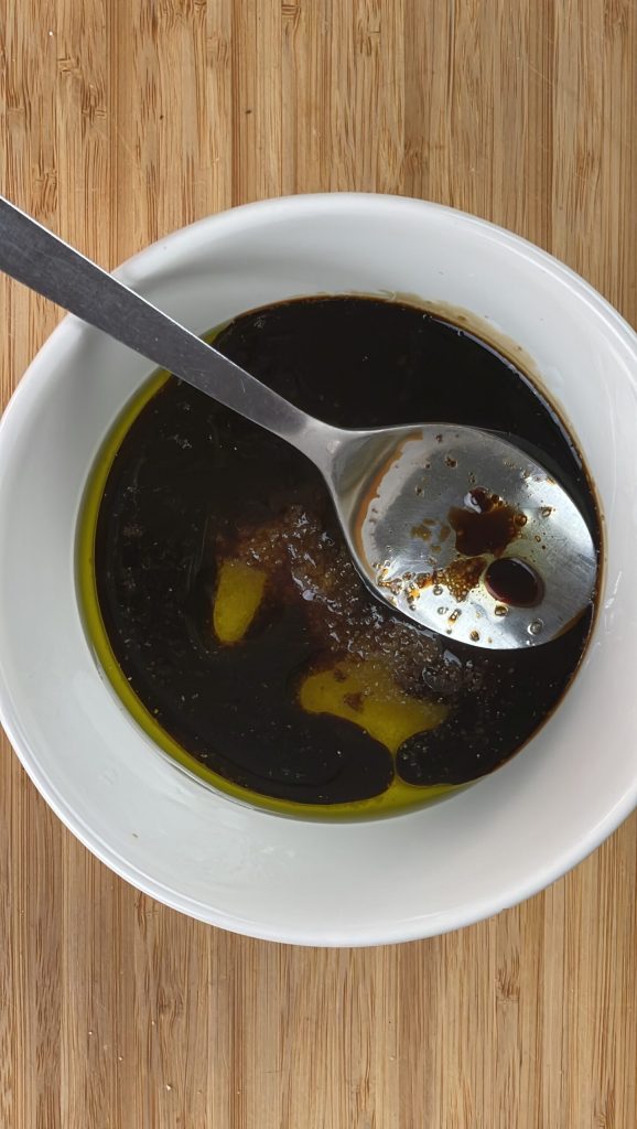 Start the preparation of oven-glazed carrots by placing the brown sugar, garlic powder, extra virgin olive oil, and soy sauce in a bowl.