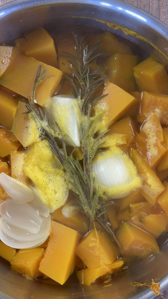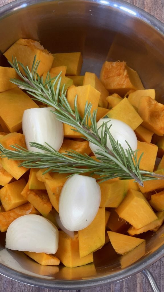 • Transfer the delica pumpkin into a pot with the white onion pieces and two sprigs of rosemary.