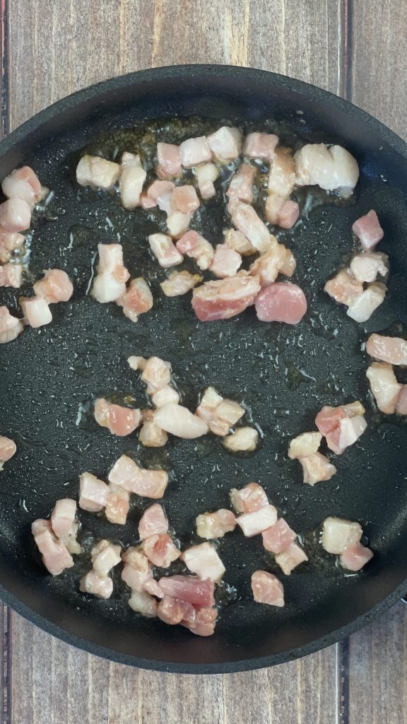• In a hot pan, cook the bacon for about 5 minutes.