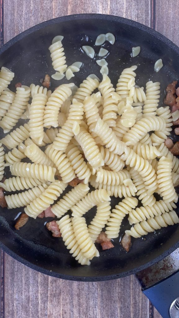 • Drain the pasta al dente directly into the bacon pan.