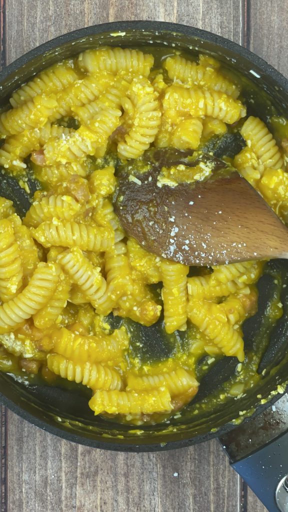 Add the pumpkin cream and toss the pasta.