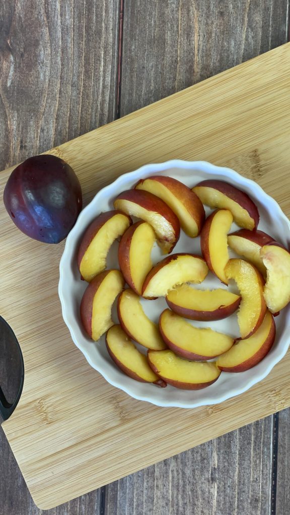 Start the preparation of the peach crumble by washing and drying the peaches. Since it’s a smooth-skinned variety, I decided to leave the skin on; if you don’t like it, you can remove it.