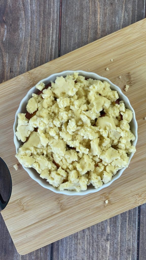 Take the seasoned peaches back and place the newly prepared crumble chunks on top.
