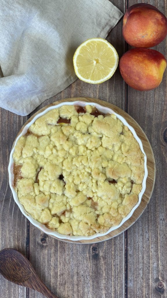Peach Crumble, a dessert that combines the sweetness and juiciness of peaches with a crunchy and crumbly topping, creating a very pleasant contrast of textures.