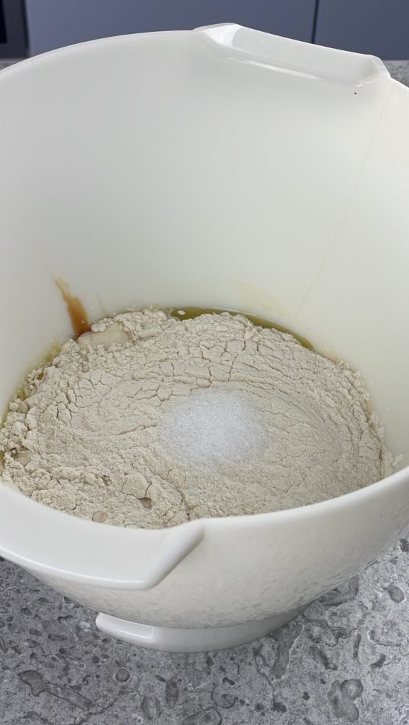 • Continue the preparation by adding the barley malt (you can replace it with a tablespoon of honey or 2 tbsps of sugar) and 1 tbsp of extra virgin olive oil to the stand mixer’s bowl.