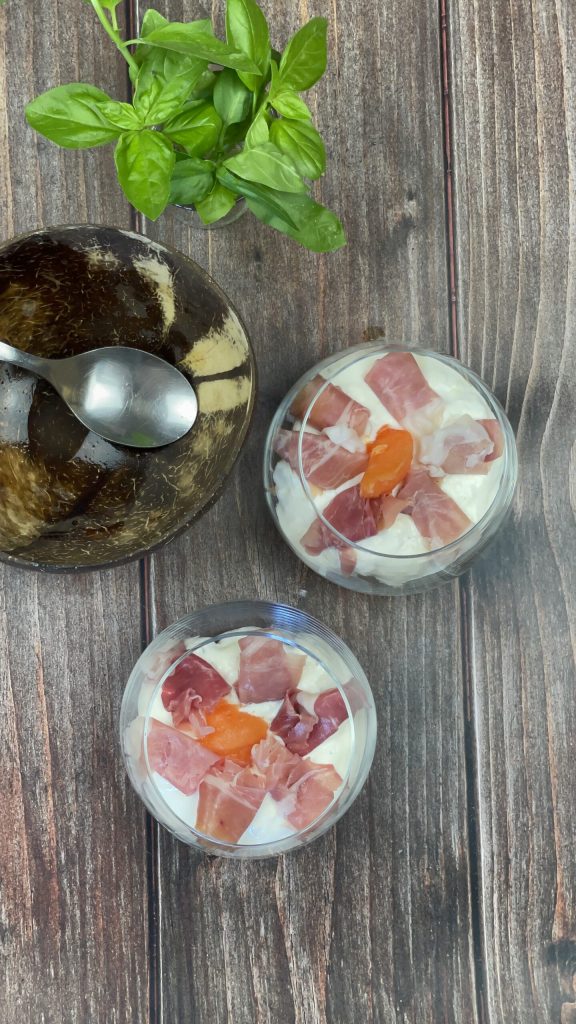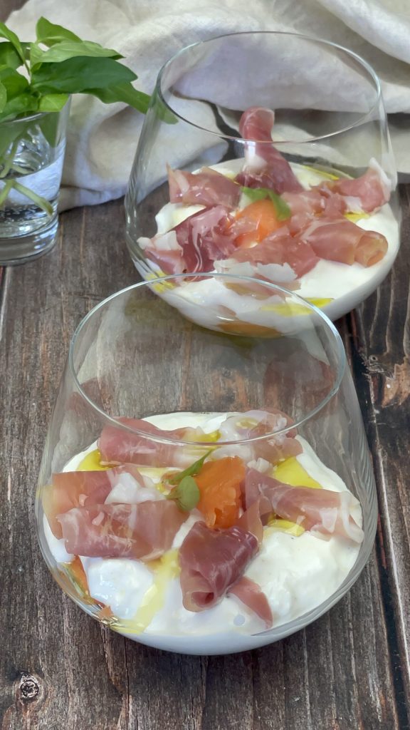 It is served in a glass or a small bowl and consists of layers of cantaloupe melon, Apulian stracciatella seasoned with extra virgin olive oil and basil, and prosciutto.