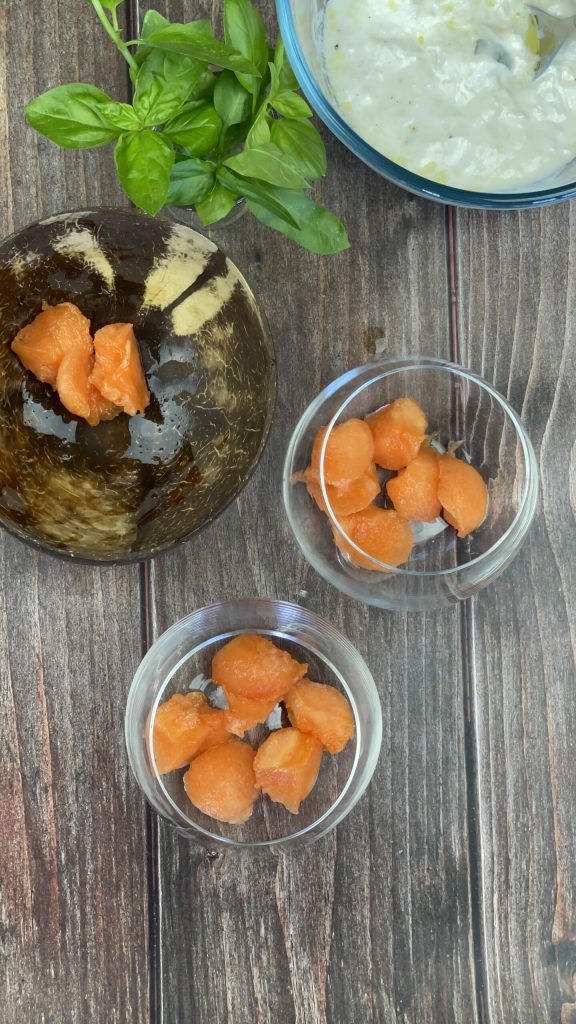 Mix with a spoon and set aside.Cut the cantaloupe melon in half and remove the seeds with a spoon.
