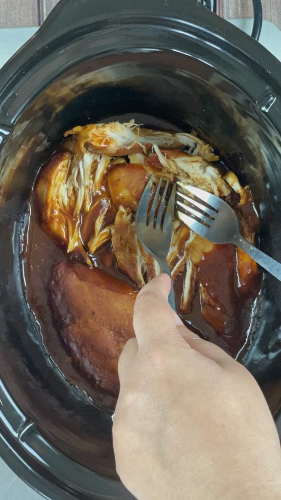 Use two forks or special silicone combs to shred the chicken, while mixing it well with the cooking sauce.