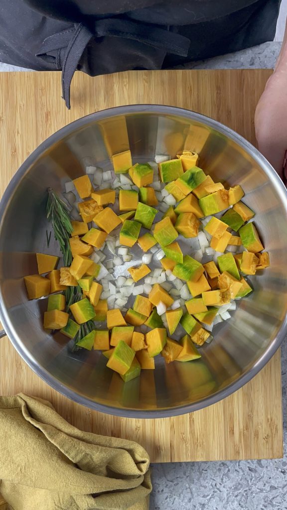 Sauté it in a pan with two tablespoons of extra virgin olive oil and a sprig of rosemary.Peel the Delica pumpkin and remove the seeds (don’t throw them away, roasted in the oven they are delicious).