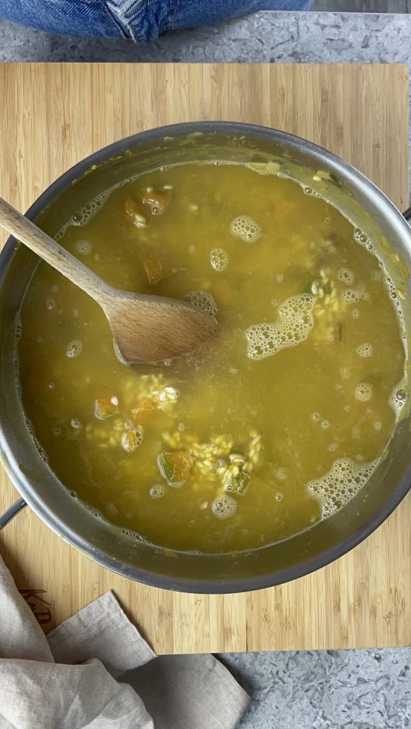 Once all the wine has evaporated, cover the rice with vegetable broth or salted boiling water.
