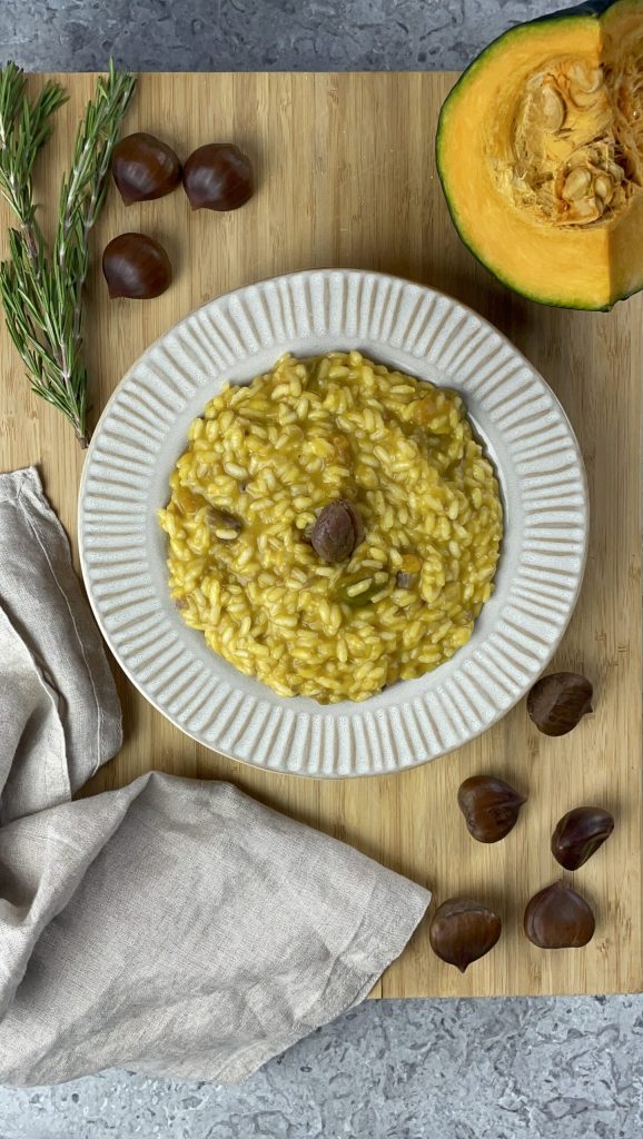 Pumpkin and Chestnut Risotto, a perfect dish for autumn that combines the sweetness of the Delica pumpkin with the velvety note of chestnuts, creating a blend of rustic and refined flavors.