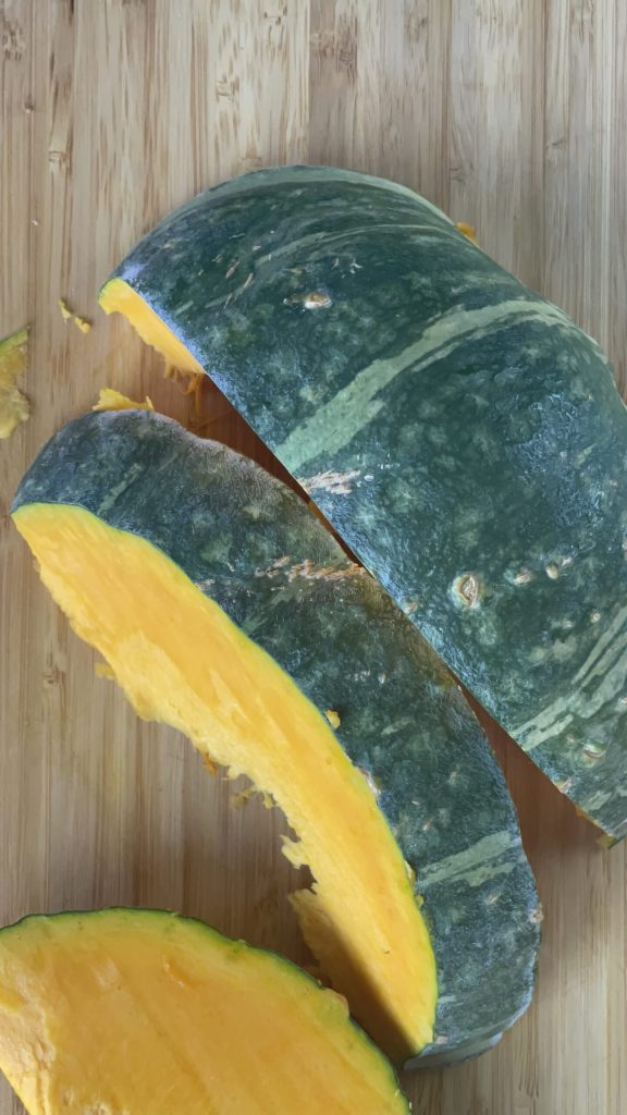 Cut the delica squash in half and remove the seeds but don’t throw them away, toasted in the oven they are delicious!