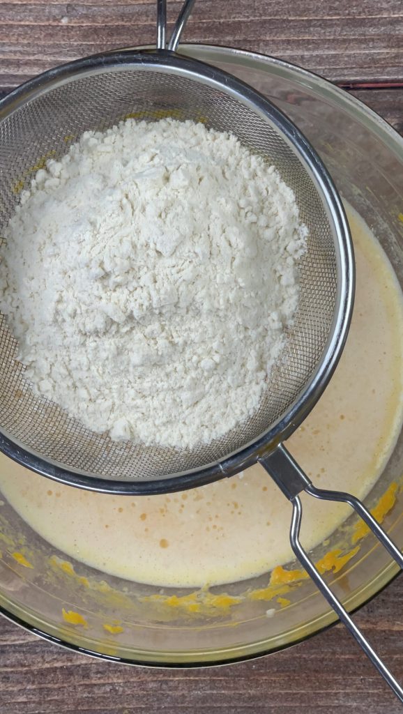 Also add the milk little by little while stirring constantly.Sift the all-purpose flour and baking powder into the bowl with the wet ingredients and sugar.