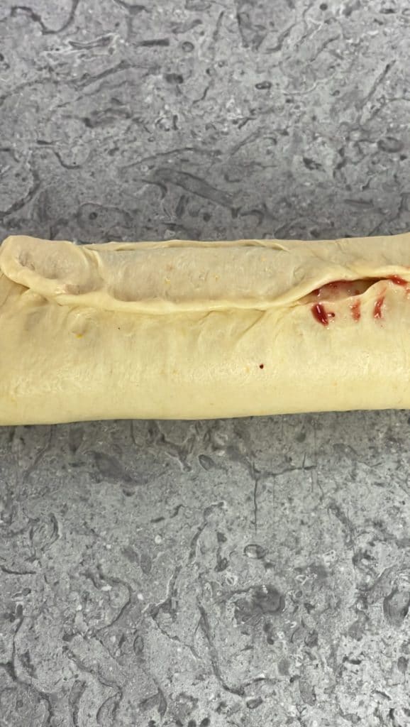 Roll up the dough along the short side and seal the roll well by pinching the seam with your fingers.