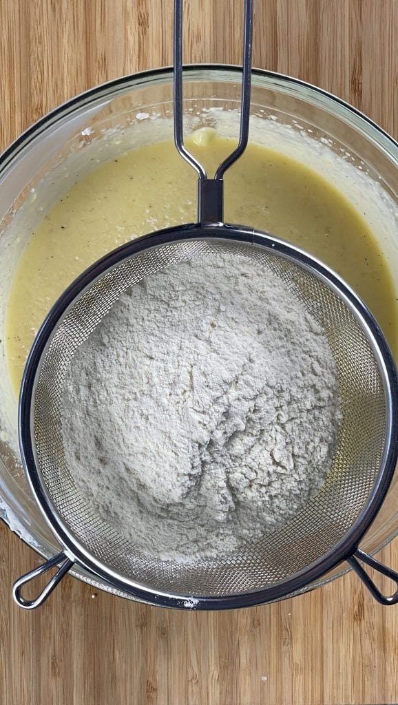 Also, add the ricotta to the bowl and make the mixture homogeneous with the help of a mixer.Sift flour and baking powder into the bowl with the rest of the ingredients.
