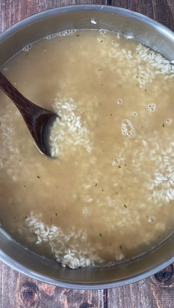 Once the wine has evaporated, cover the rice with the vegetable broth.