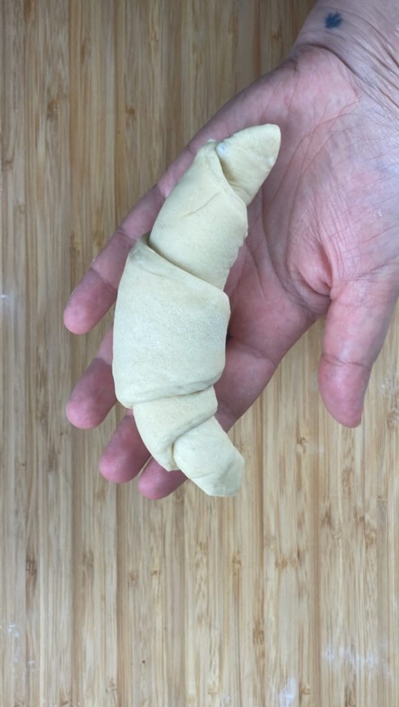 • Form the croissants: starting from the base, roll each wedge onto itself, and once formed, gently press the tips.