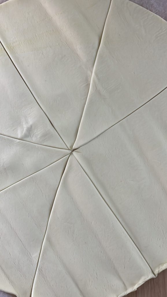 Start preparing the savory puff pastry croissants with salmon and ricotta by dividing the roll of puff pastry into 16 triangles using a knife or a pastry cutter.