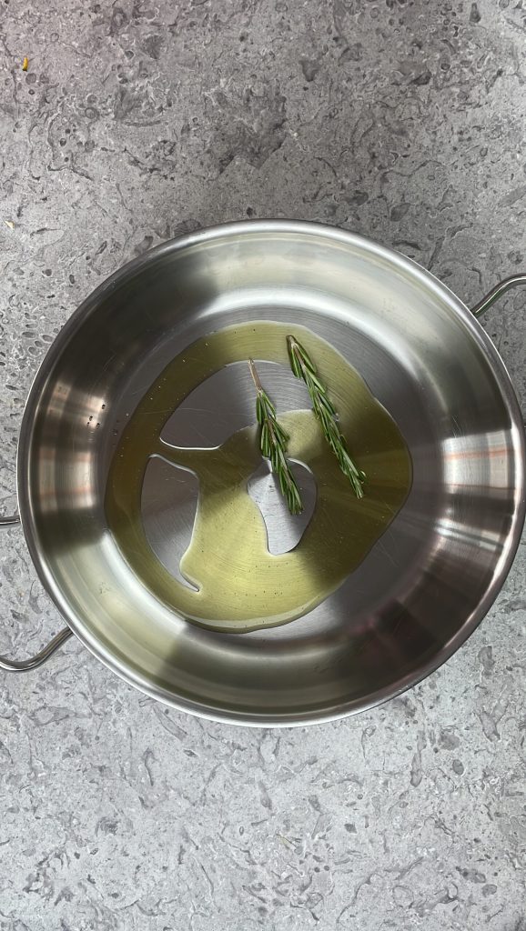 • Start preparing the savory pie with pumpkin, Taleggio, and black kale by heating extra virgin olive oil in a pan with two sprigs of rosemary.