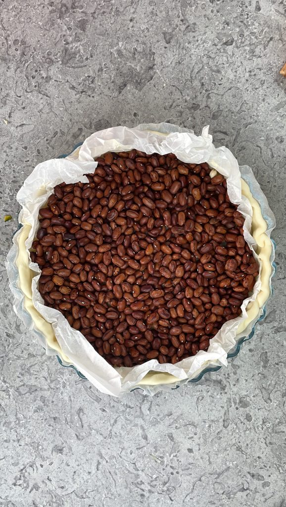 • Roll out the shortcrust pastry on a round baking dish about 12 inches. Fold the edges and prick the base, then cover everything with dry legumes or the special ceramic weights.