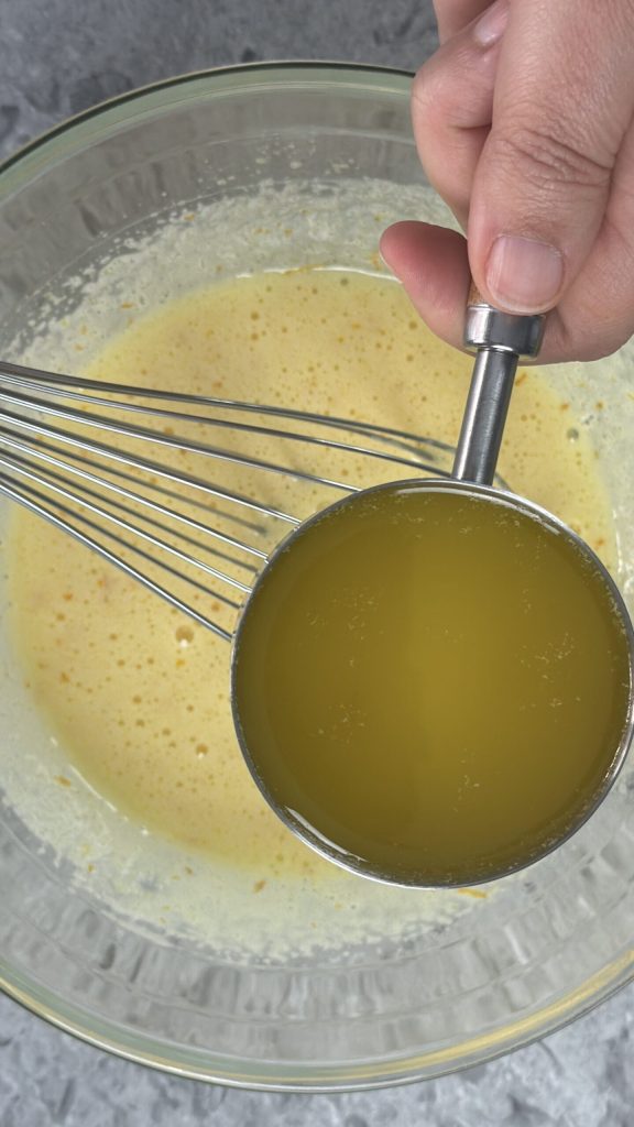 With the mixer still running, slowly pour in the melted butter in a thin stream.