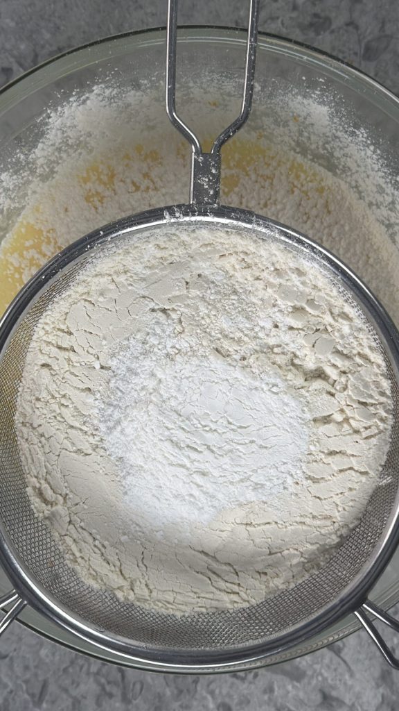 Sift the all-purpose flour and the baking powder into the bowl with the wet ingredients.