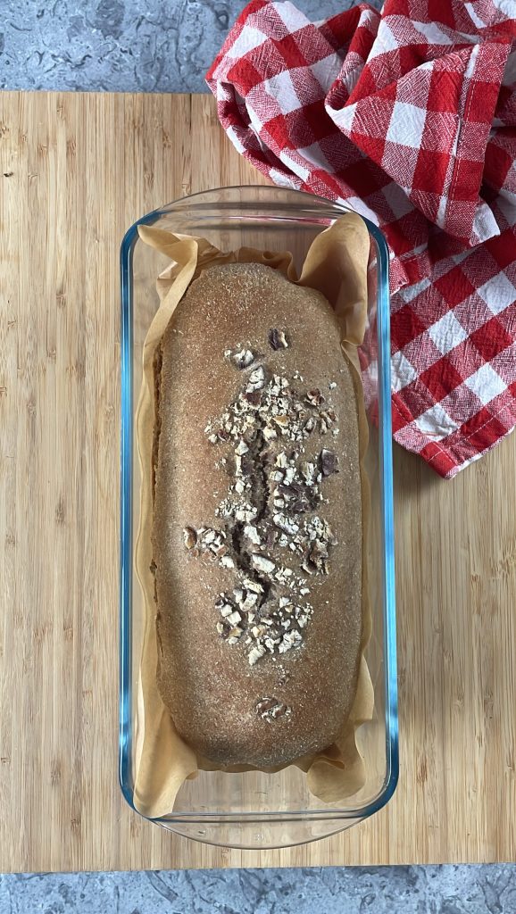 Transfer the bread into a 12-inch loaf pan lined with parchment paper and garnish with additional crumbled boiled chestnuts.Bake the soft chestnut bread in a preheated static oven at 392°F for about 45-50 minutes. If it darkens too much during baking, cover it with aluminum foil.