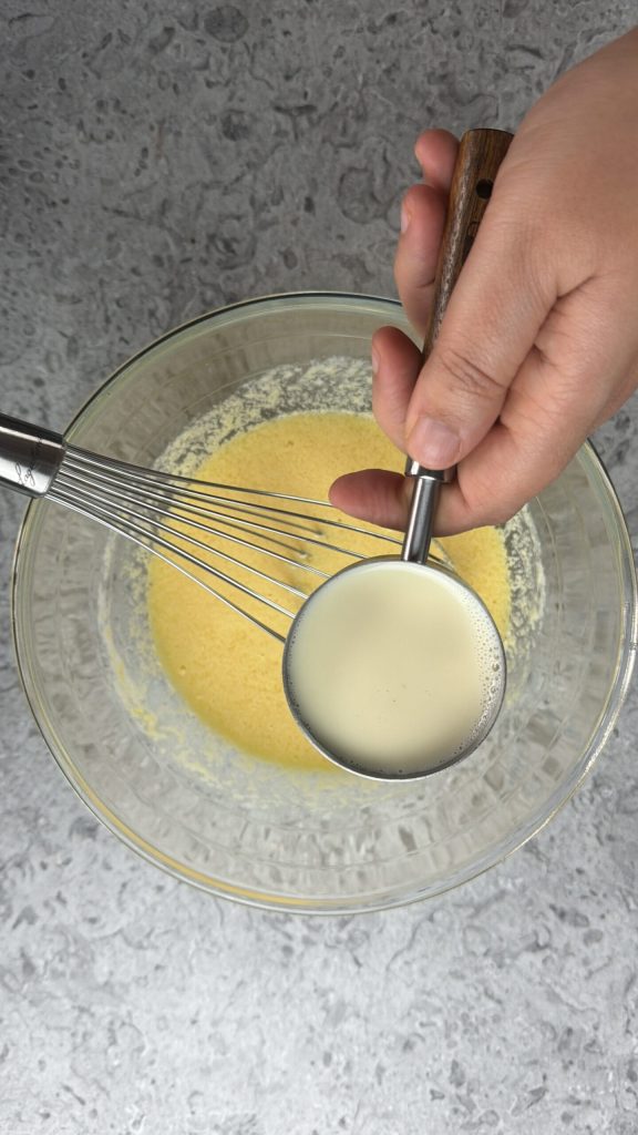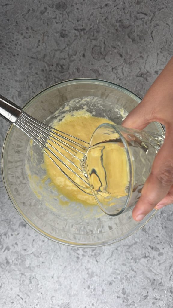 Pour the sunflower oil in a thin stream while continuing to stir.