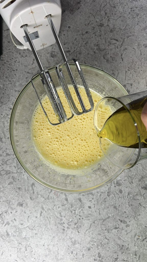 This soft olive oil cake is prepared in a few minutes with an electric mixer, mixing simple pantry ingredients. The batter is quick and without difficult steps: just work the eggs and sugar, add the olive oil, the milk and finally the flour with the baking powder. In less than 10 minutes the cake is ready to go into the oven, and after about 40 minutes of baking you get a tall, soft ring cake perfect for slicing.
