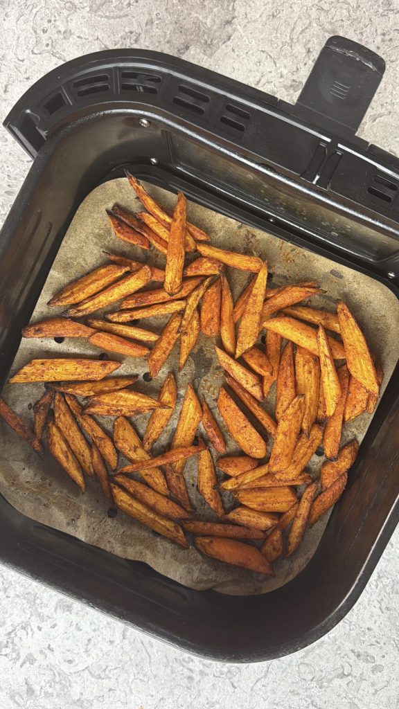 Cook the spiced carrot sticks in the air fryer for 13–15 minutes, turning them halfway through cooking.
