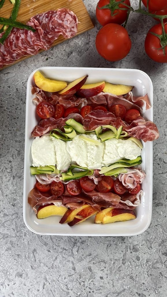 The juicy and fragrant nectarine adds a fresh and fruity note that goes perfectly with the cured meats. The thinly sliced raw Romanesco zucchini provides crunch and a green touch that adds color to the platter. The cherry tomatoes, along with the buffalo mozzarella, bring summer to the table with their simplicity.