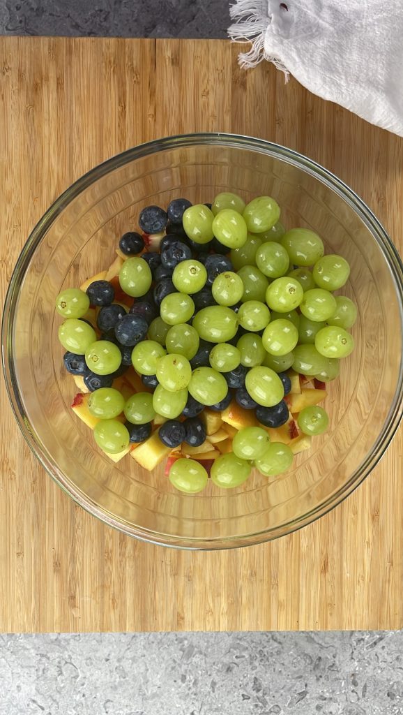Wash and drain the blueberries and grapes. If using a seedless variety of grapes, leave them whole; otherwise, cut the grapes in half and clean them.