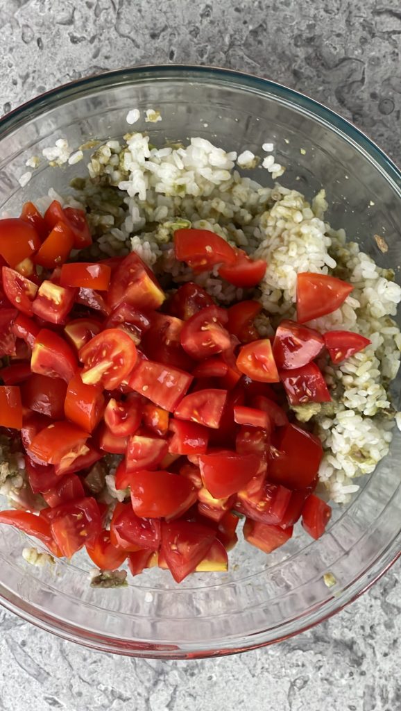 Add them to the rice and mix again.Drain the corn well and add it to the bowl with the rest of the ingredients.
