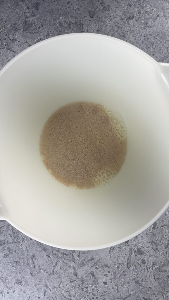 Start preparing the sweet cinnamon focaccia by dissolving the yeast in warm milk directly in the stand mixer’s bowl.