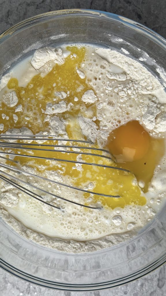 • Continue by adding the wet ingredients to the dry mixture: the egg, the milk and the warm melted butter.
