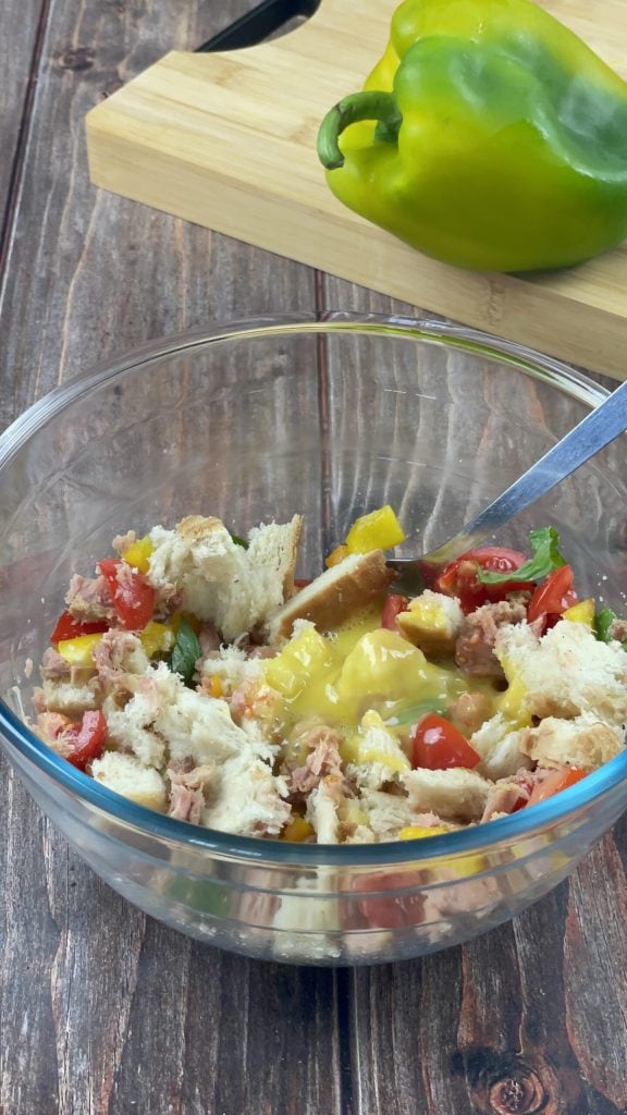 • In the meantime, prepare the filling: put the broken white bread and drained tuna in a bowl.