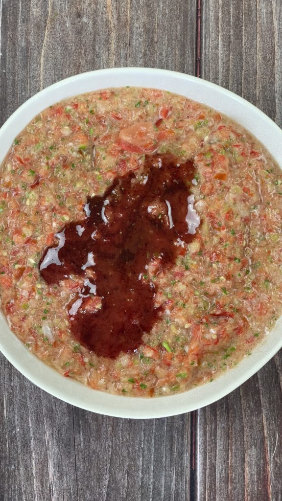 To prepare ezme, tomatoes and peppers are generally finely chopped and mixed with onion, garlic, parsley, and spices. Some variations – like the one proposed – may also include lemon juice or vinegar to add acidity and freshness.