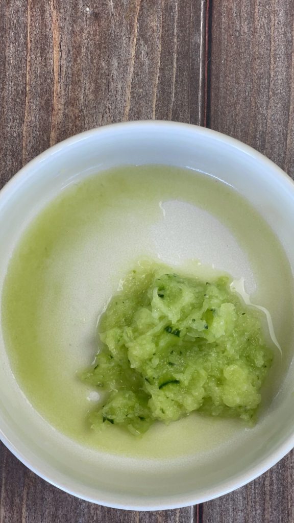 Grate it into a bowl and then squeeze it with your hands to remove its water.Put the Greek yogurt in a bowl and mix it with a spoon or hand whisk until it becomes creamy.