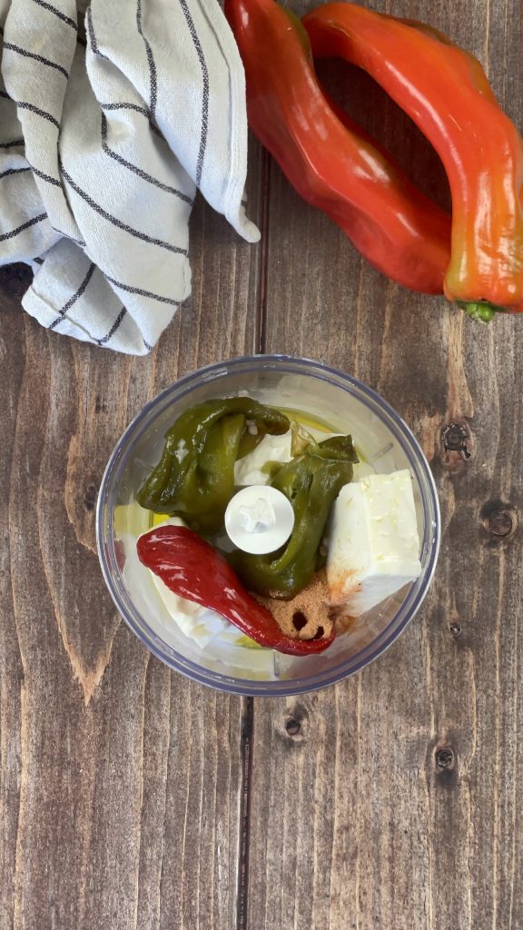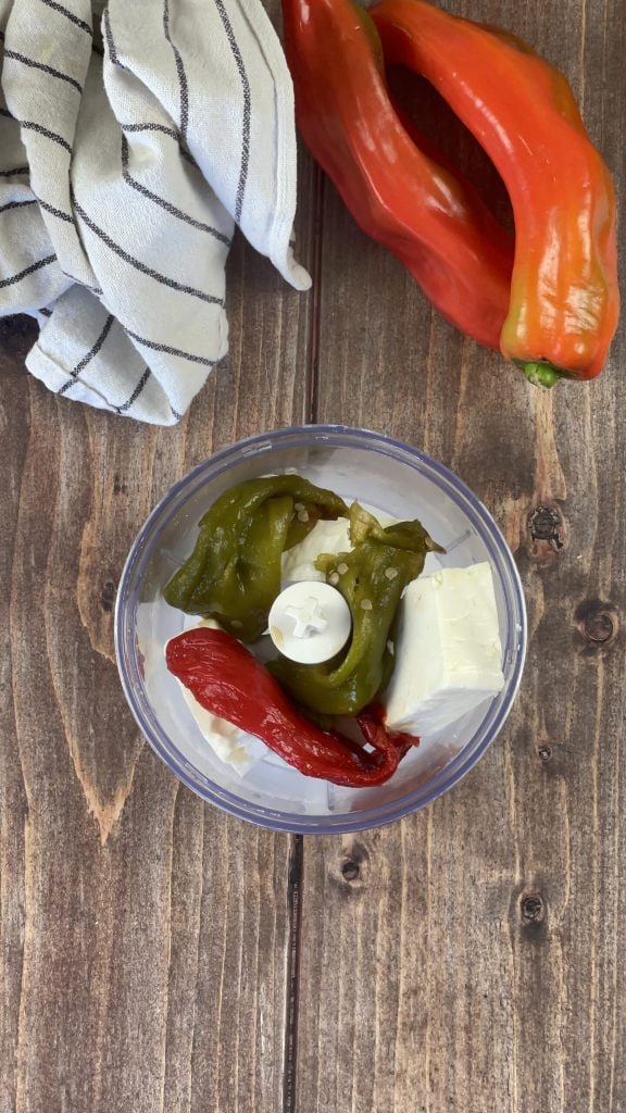 • Start the preparation of the whipped feta with peppers by preheating the air fryer to 392°F for 5 minutes.
