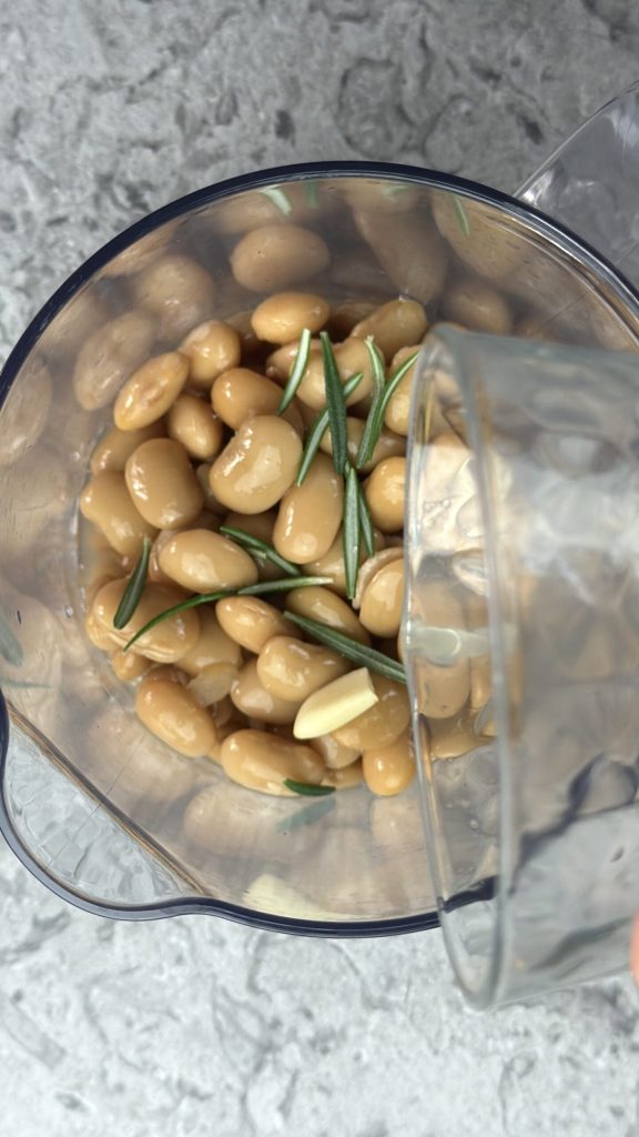 Begin preparing the white bean and rosemary hummus by draining and rinsing the white beans.